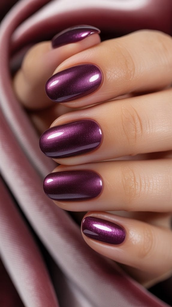 Velvet violet nails offer a luxurious and sophisticated look, combining deep purple and hints of shimmer. This color is perfect for those who want a bit of drama in their fall look.