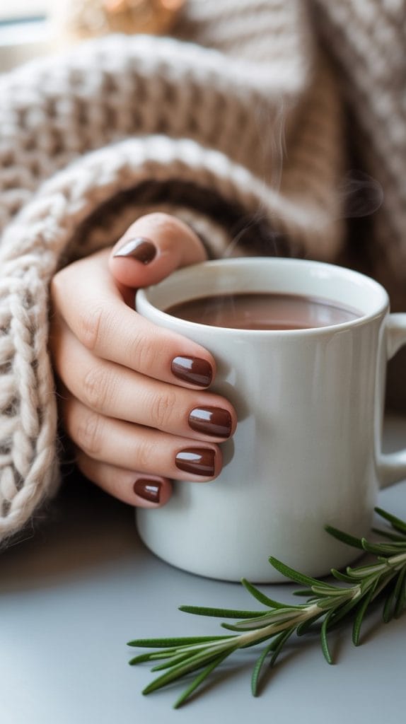Warm and inviting, chocolate brown nails are a fall favorite. This shade embodies the cozy feeling of a hot cocoa by the fire and is ideal for those who love a more earthy palette. It’s a versatile color that looks great with both casual and formal attire.
