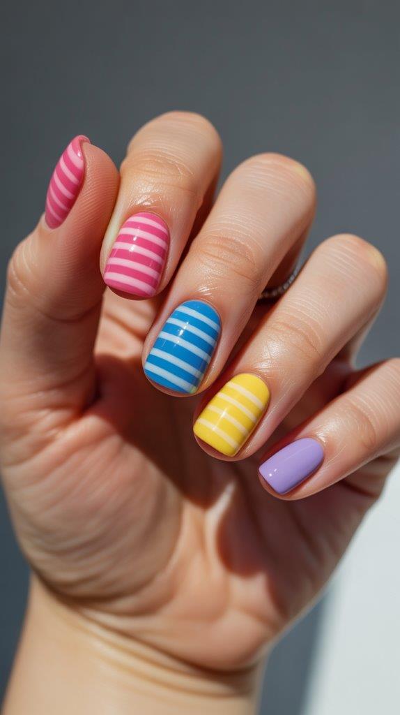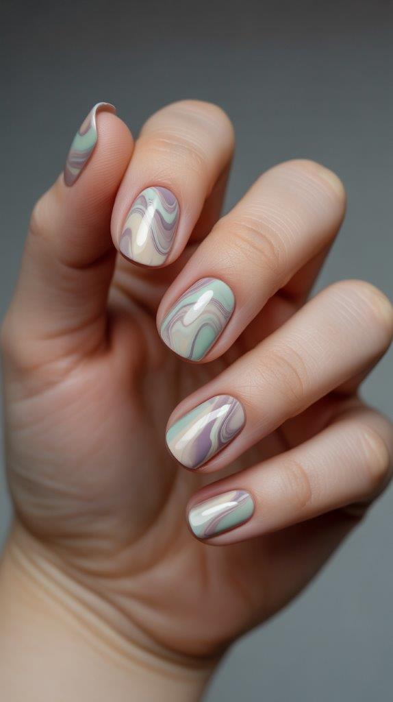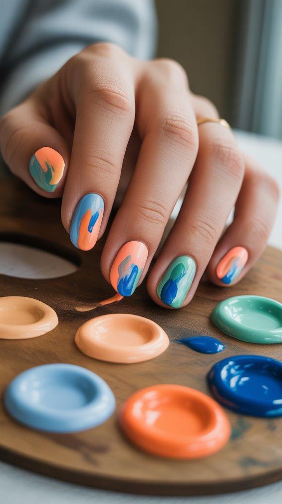 Grab a thin, flat brush and some pastel polishes. Make bold, sweeping strokes across your nail, letting the colors overlap slightly. Don’t overthink it! The goal is an artistic, effortless look. It feels modern, painterly, and cool.