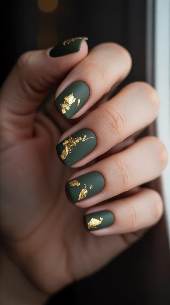 Bring in a touch of elegance with delicate gold leaf. After your base color (a deep pastel like plum or forest green works great), apply a small piece of crumbled gold leaf using a dotting tool and top coat. It looks like delicate, gilded vines or abstract art. So chic.