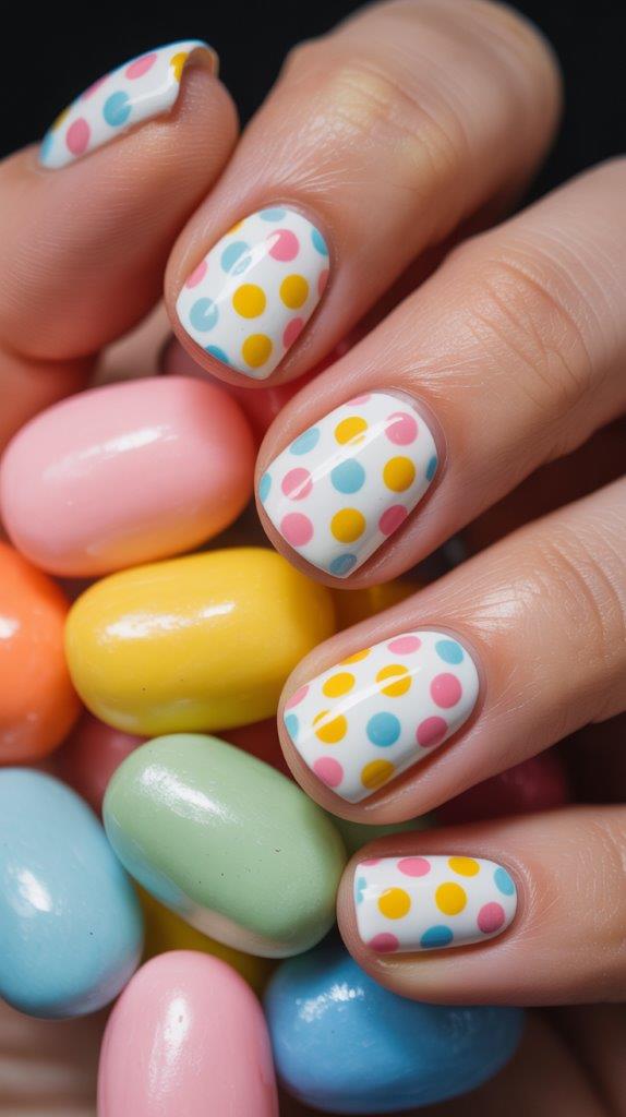 You can never go wrong with polka dots. Use a dotting tool to create uniform dots in a contrasting color. For an Easter twist, do pastel dots on a white base, or white dots on every pastel nail in your mismatched set (see idea #9). It’s timeless and joyful.