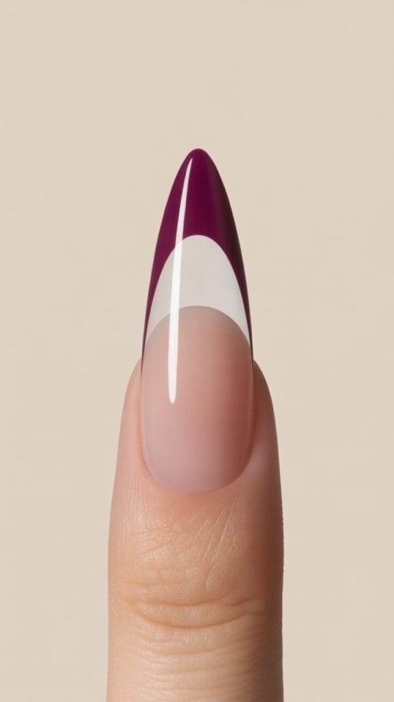 Here’s another modern take on the French manicure, perfect for the sharp stiletto shape. Instead of a curved line at the tip, the Deep V French features two lines starting from the sides of the nail that meet in a sharp V shape at the point. In a dark color like burgundy or forest green, it’s edgy and incredibly flattering.