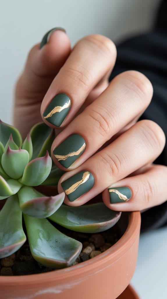 Deep, earthy moss green gets a luxe upgrade. While the green polish is still wet, drag a thin line of gold leaf flakes or metallic gel through it in irregular, vein-like patterns. It looks like a beautiful, precious stone.