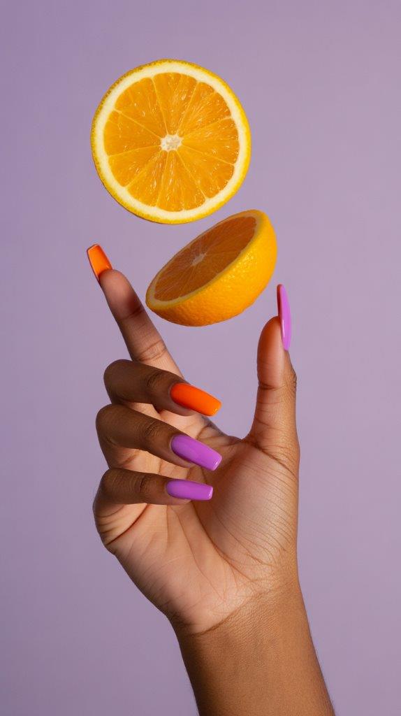 This color combo is unexpectedly electric. Try stripes, color blocking, or even just painting each nail in alternating orange and lilac. It sounds wild, but trust me, it works and looks incredibly fresh.
