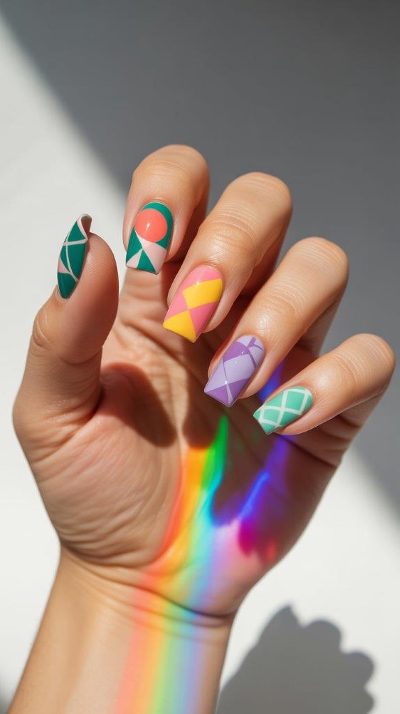 Each nail features different geometric shapes—triangles, circles, squares—in various spring colors. The variety is intentional and creates a funky, art-school aesthetic that’s very now.