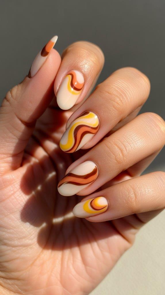 Groovy swirls in orange, yellow, and brown on cream bases. The retro vibe is having a serious resurgence, and these psychedelic swirls capture that perfectly. Funky vintage is very trending for spring 2026.