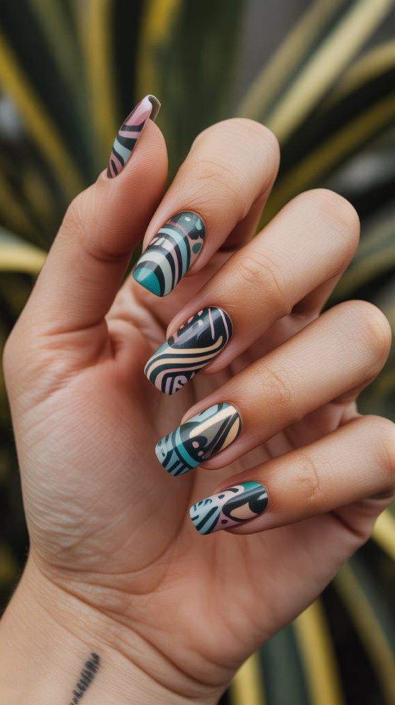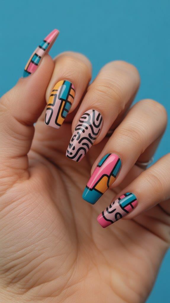 ’80s Memphis design movement patterns—squiggles, geometric shapes, bold colors all mixed together. This maximalist aesthetic is having a moment, and it translates perfectly to funky spring nails. FYI, Memphis design is all over home decor right now too.