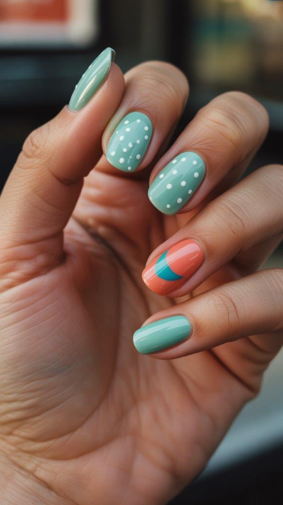 Bold blocks of contrasting spring colors arranged asymmetrically across each nail. Think bright green meeting hot pink meeting electric blue in unexpected divisions. The asymmetry is what makes it funky—predictable is boring, unexpected is trending.