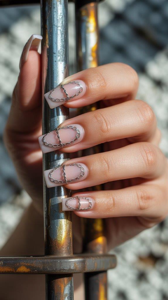 Hand-painted or actual tiny chain details creating industrial-meets-pretty vibes. The juxtaposition of delicate nails with tough hardware elements creates interesting tension. This design has edge while staying spring-appropriate.