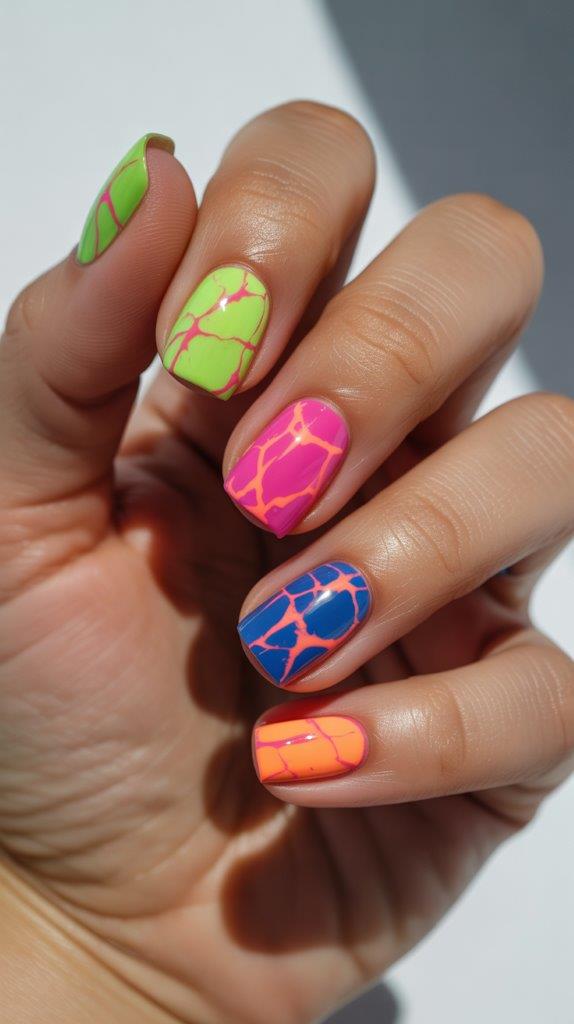 Crackle topcoat is back but styled differently. Layer bright crackle over contrasting bases for intentional texture chaos. The ’90s throwback feels fresh when done with current color palettes.