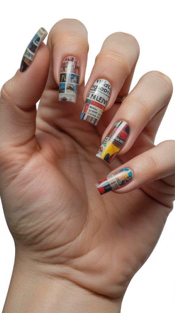 Tiny magazine text or image pieces sealed under clear topcoat creates collage nails. The mixed media approach is artistic and unique. Each nail becomes a tiny piece of found art—very funky, very 2026.
