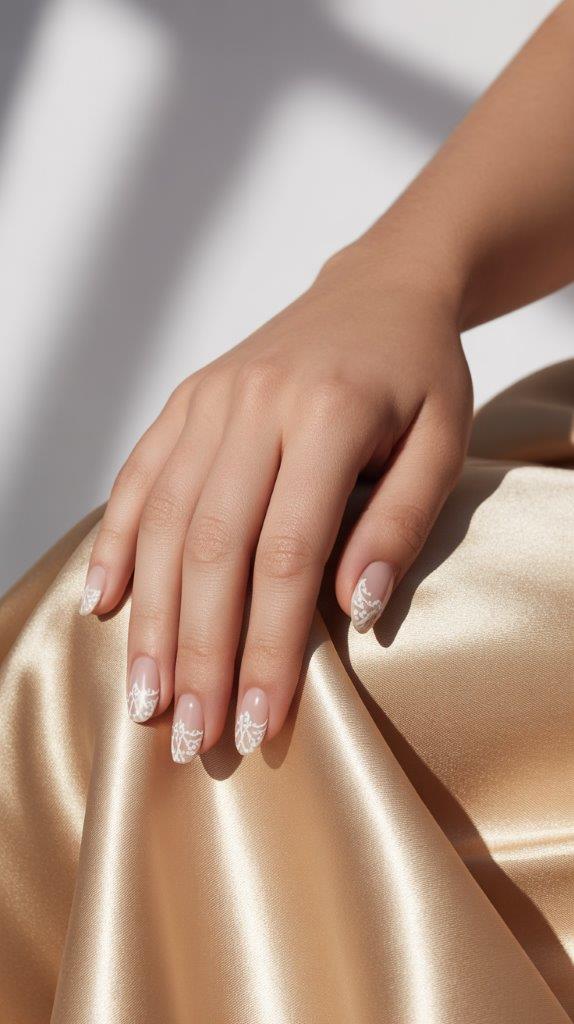 Incredibly feminine and vintage-inspired. A sheer nude base gets a delicate lace appliqué or hand-painted lace detail at the base of the nail. It’s soft, romantic, and pairs beautifully with pearls or a classic dress. It whispers elegance.