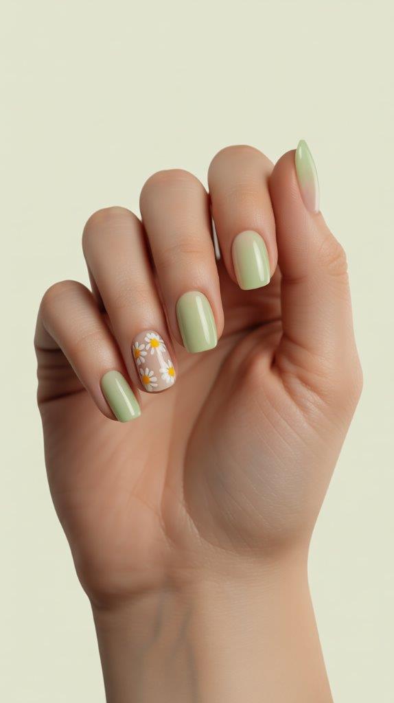 Paint all nails a sheer, milky pastel green. Then, on one or two accent nails, add hand-painted tiny white or yellow daisies. It’s feminine, delicate, and gives major cottagecore vibes. This design proves that sometimes, the smallest details have the biggest impact.