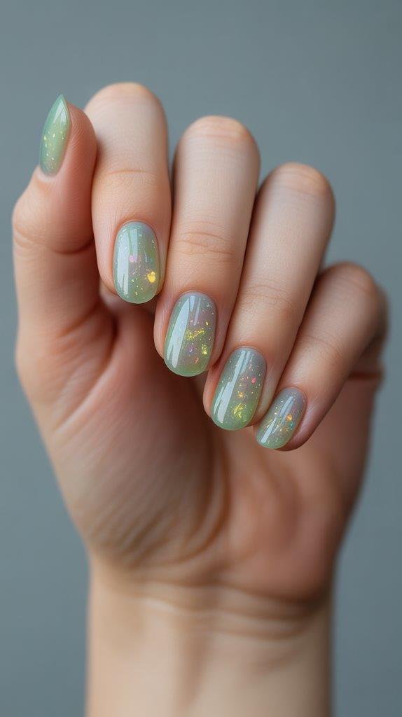 “Jelly” polishes have a sheer, squishy look that’s to die for. Build up a few coats of a green pastel jelly, then sandwich iridescent flakies between the layers. The flakes will sparkle with hints of gold, blue, and pink from within, like you captured a little piece of aurora borealis on your nails.