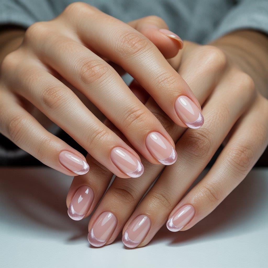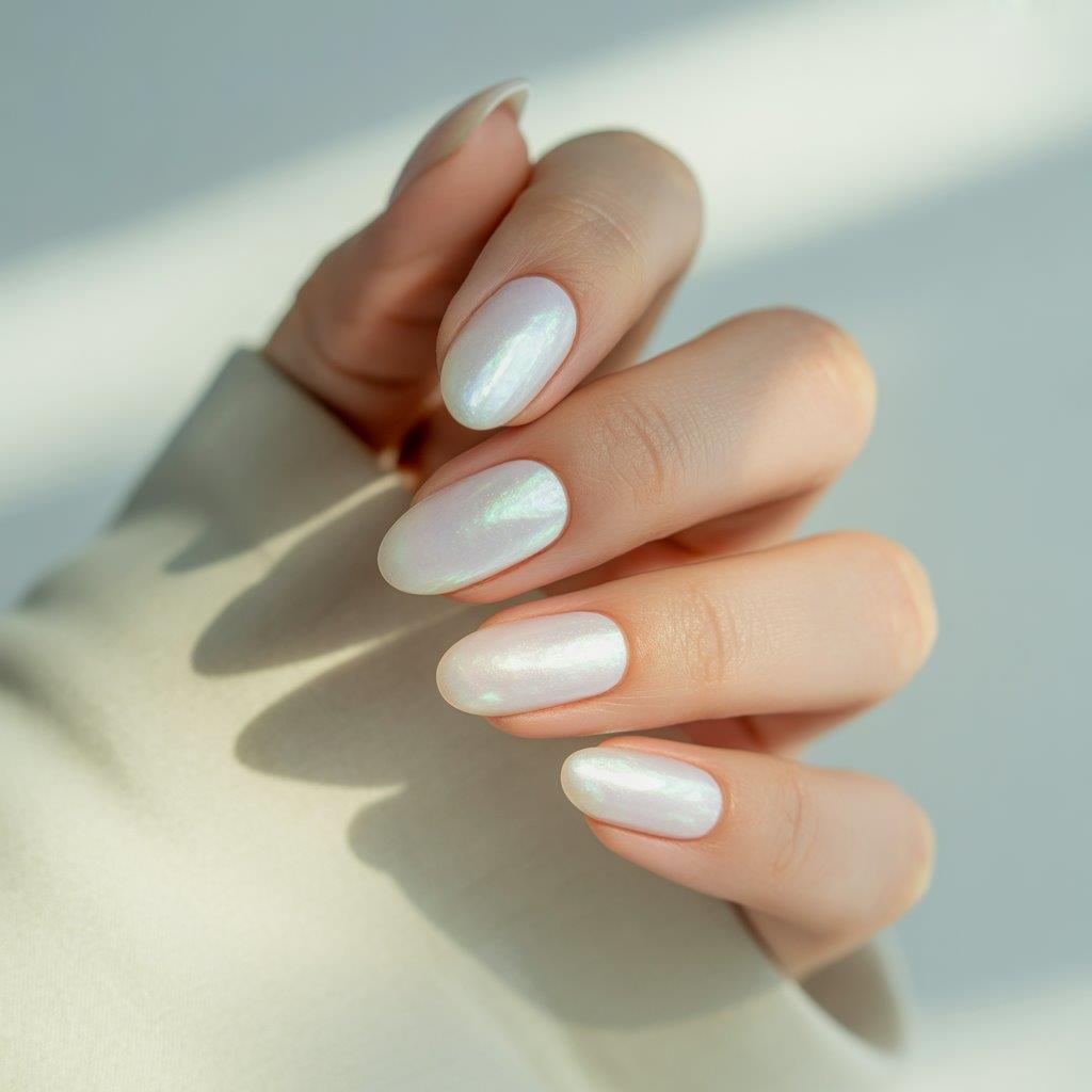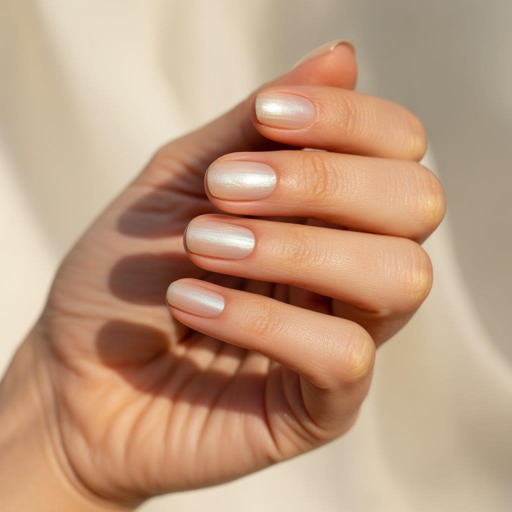 Nude nails with a soft pearl sheen look elegant and polished.