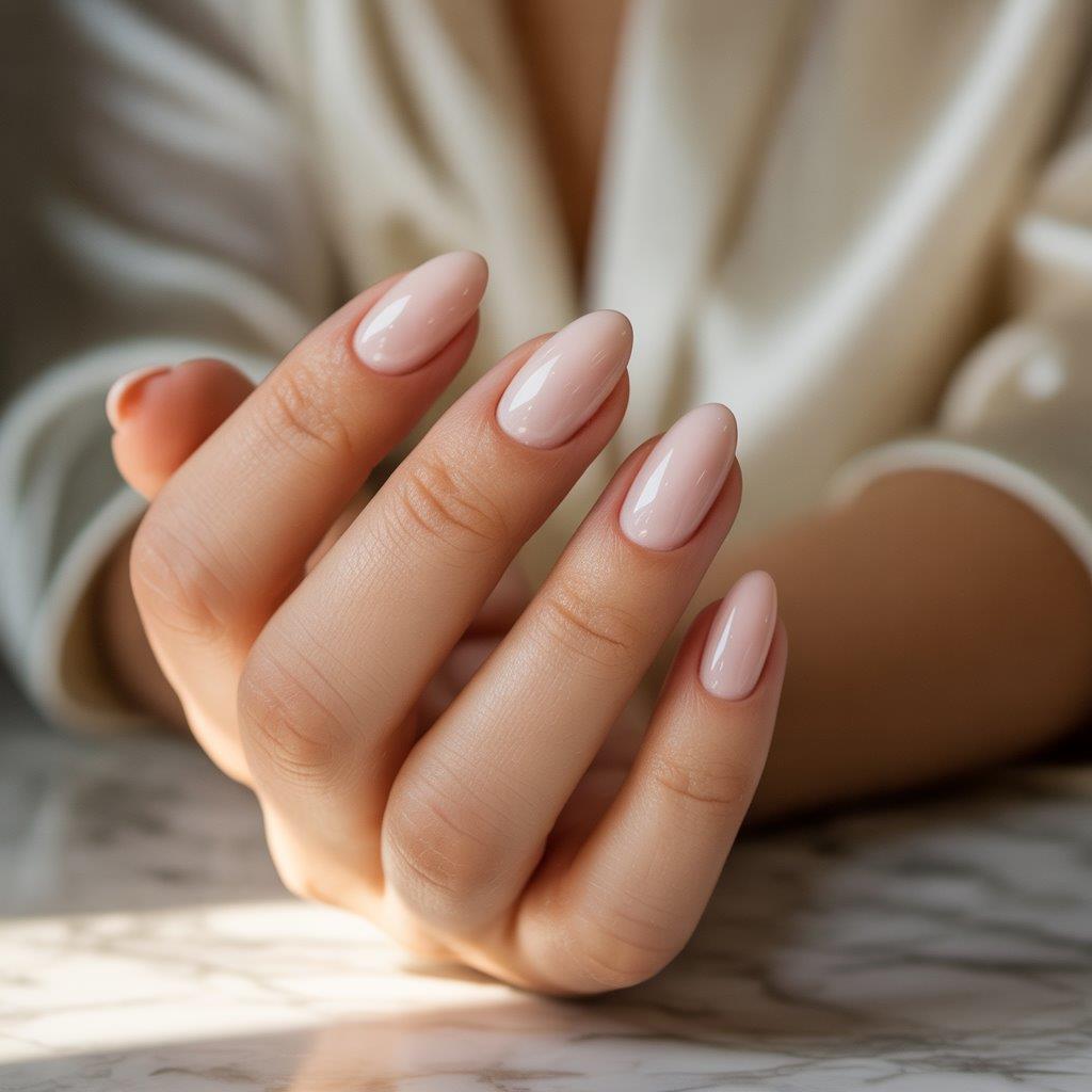 If you want “quiet luxury nails,” a glossy nude on almond-shaped nails screams elegance.