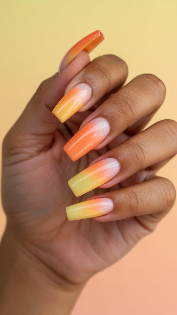 Let’s start strong with sunset ombré that transitions from deep coral through peachy-pink to pale yellow at the tips. This gradient screams summer vacation and good vibes, and honestly, it never fails to make me happy.