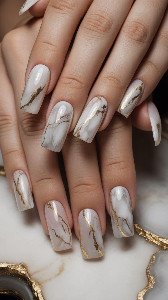 If you want to look expensive without actually saying it, white marble with gold veining is your move. This design screams luxury spa and designer everything, even if you’re just wearing sweats.