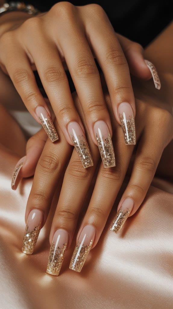 Need something celebratory? Champagne glitter fading from nude to full sparkle at the tips is basically a party on your fingertips.