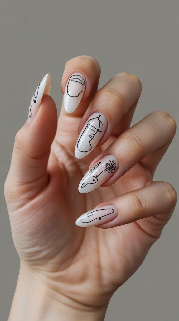 For the artistic souls, white base with delicate black line art turns your nails into tiny canvases. Each nail can feature different minimalist designs—geometric shapes, abstract faces, simple florals, or dots.