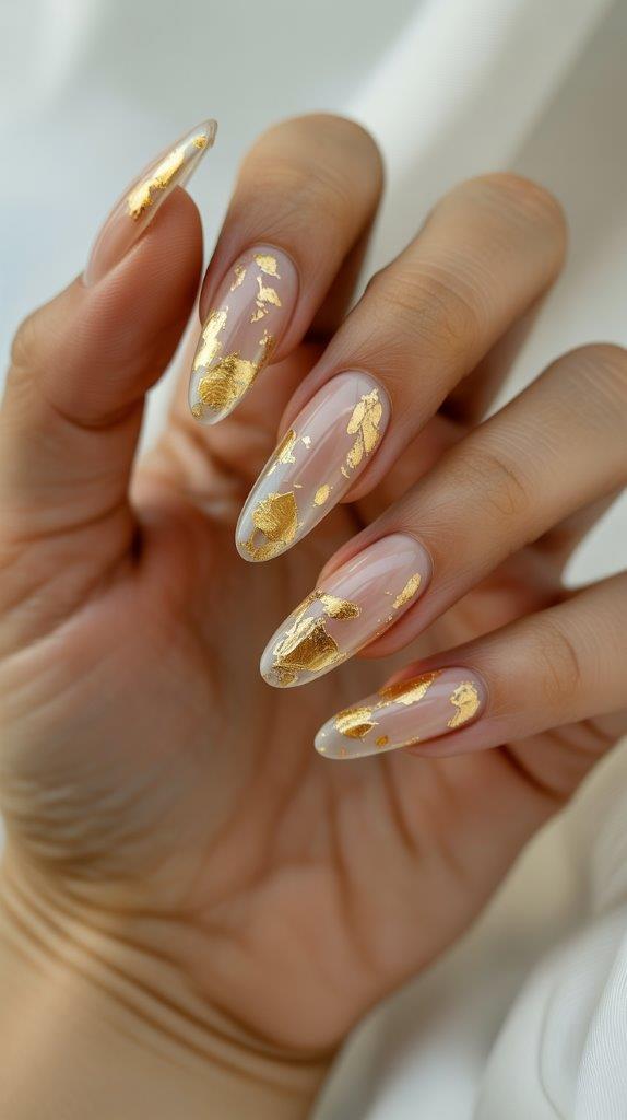 The transparency lets your natural nail show through while the gold adds that luxury factor. It’s delicate and artistic without being fussy. I love how organic and random the gold placement looks—like tiny pieces of treasure trapped in glass.