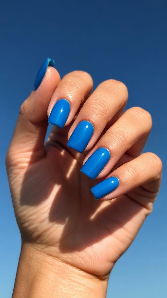 Saturated electric blue acrylic covering medium square nails completely. The vivid color is perfectly suited to summer, and the square shape prevents it from being too much. Acrylics provide the opacity that electric blue needs to look truly stunning.