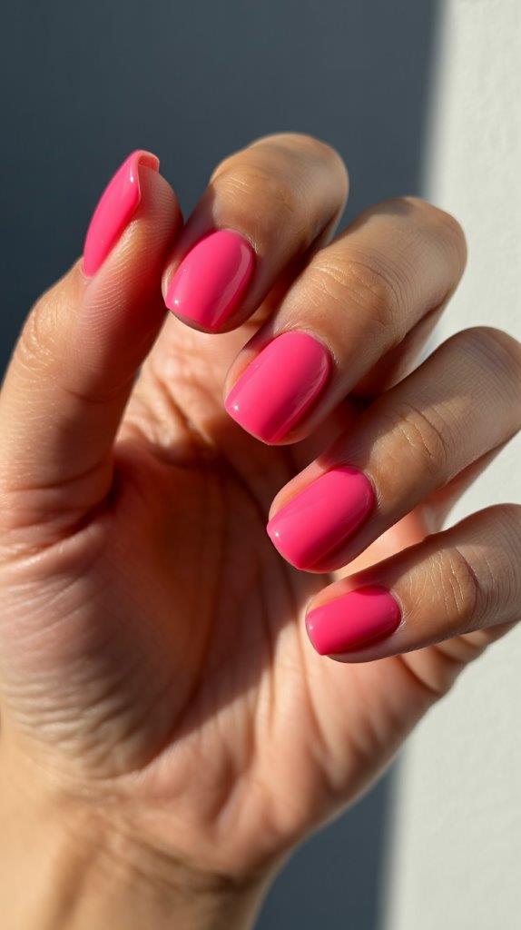 Saturated hot pink acrylic on medium square nails screams summer fun. The vibrant shade is playful and confident, while the geometric shape keeps everything sophisticated. This combination is Instagram-ready and summer-perfect.
