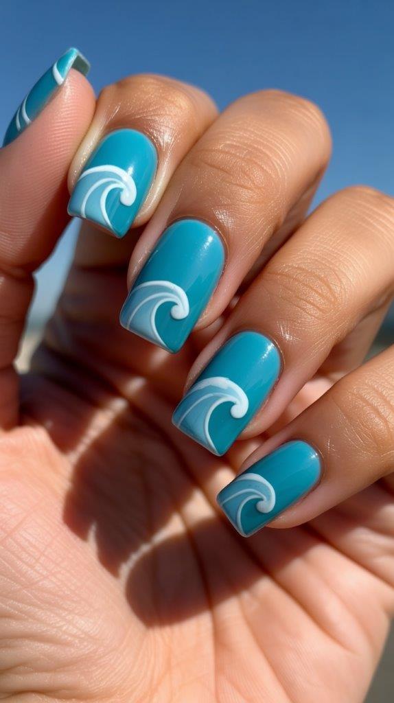 Bright turquoise acrylic base with hand-painted white waves on medium square nails. The acrylic provides the perfect smooth surface for detailed wave art. Square shape makes the wave lines look particularly crisp and intentional. This design is beach-inspired without being kitschy. IMO, this is one of the chicest ways to wear beach nails :).