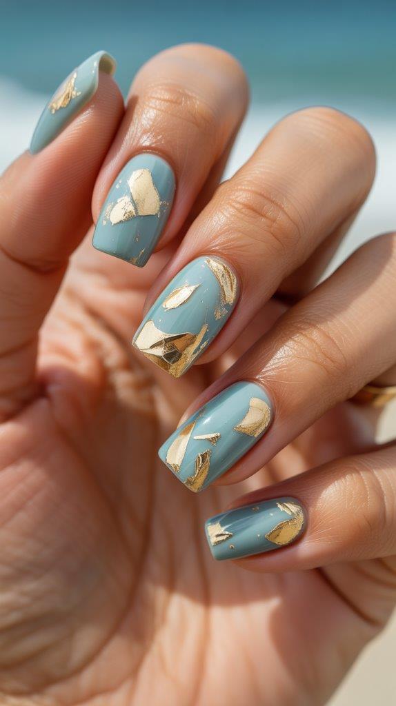 Soft blue-green seafoam acrylic base on medium square nails with random pieces of gold foil. The combination feels luxurious and beach-appropriate. Acrylics provide perfect adhesion for foil, and square shape showcases the mixed textures beautifully.