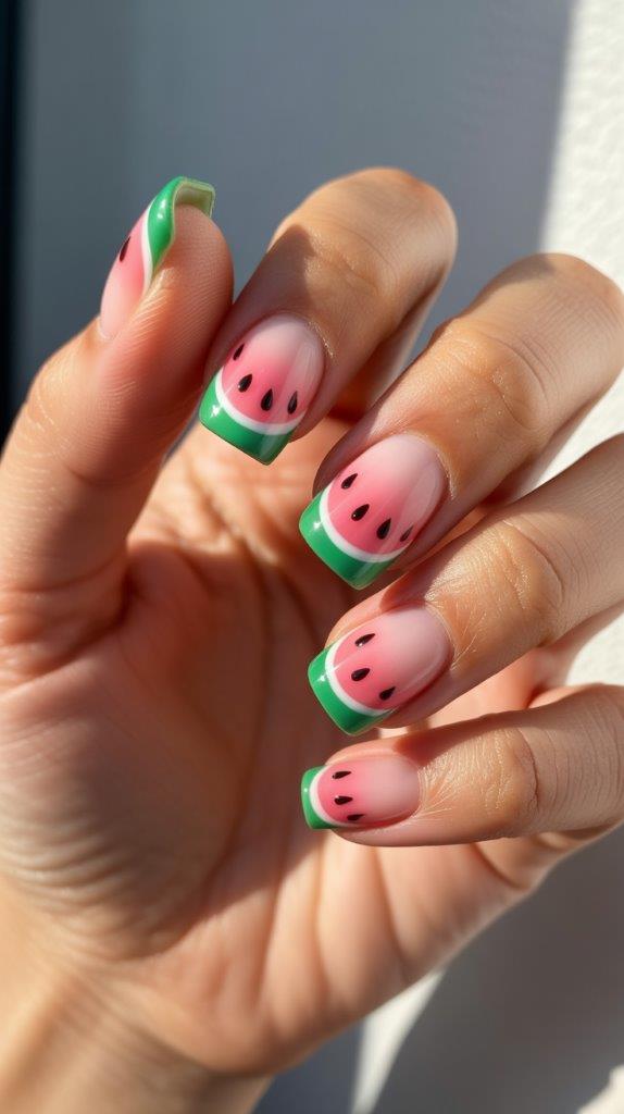 Pink acrylic base with green tips and tiny black seed details creating watermelon effect on medium square nails. The square shape provides perfect canvas for this cute summer fruit design. Acrylics allow for precise color blocking and detail work that looks professional.