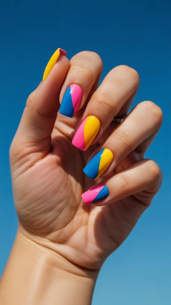 Bold geometric color blocking with summer acrylics—hot pink, electric blue, and sunshine yellow arranged in graphic patterns on medium square nails. The clean divisions look incredibly satisfying on square edges. Acrylics ensure colors stay vibrant and separated without bleeding.