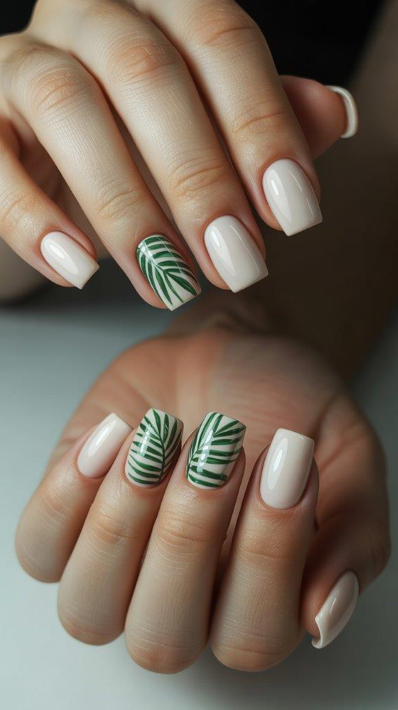 White or cream acrylic base on medium square nails with green palm leaf designs on one or two accent nails. The tropical theme is summer-perfect, and square shape keeps it modern rather than kitschy. Acrylics provide the smooth surface needed for detailed leaf art.