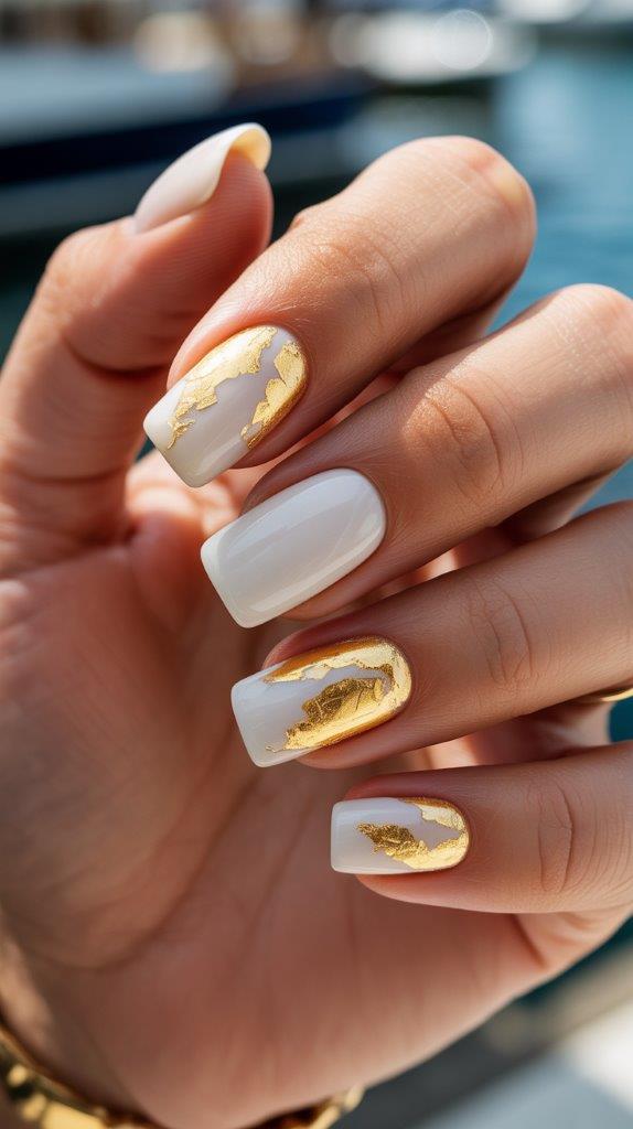 Clean white acrylic on medium square nails with strategic pieces of gold foil creating elegant accents. The combination feels luxurious and summery—very yacht club aesthetic. Square shape showcases the foil without cramping the metallic beauty. Acrylics seal everything permanently under topcoat.