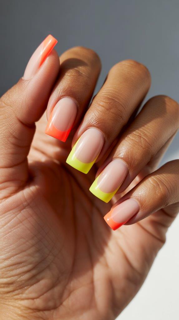 Natural nude acrylic base on medium square nails with bright neon tips in coral, yellow, or lime. This gives you bold summer color in a more wearable format. The square shape makes neon tips look particularly modern and intentional rather than dated.