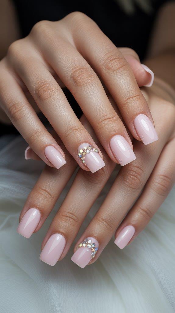 Baby pink acrylic on medium square nails with small rhinestone accents on one or two nails. The combination is feminine and elegant—perfect for summer weddings or special occasions. Acrylics hold rhinestones securely, and square shape provides clean backdrop for sparkle. FYI, rhinestones on acrylics last way longer than on regular polish.