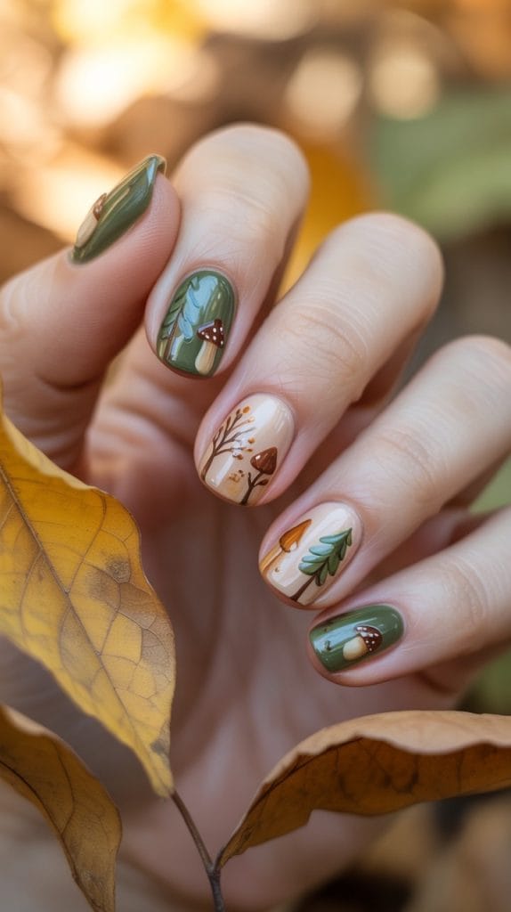 Bring the beauty of the forest to your nails with a woodland wonder design. Use earthy tones like green, brown, and beige as your base and add details like trees, acorns, or mushrooms. You can also add some gold or copper foil for a touch of magic. This design is perfect for nature lovers and those who want to capture the serene beauty of the forest in fall.