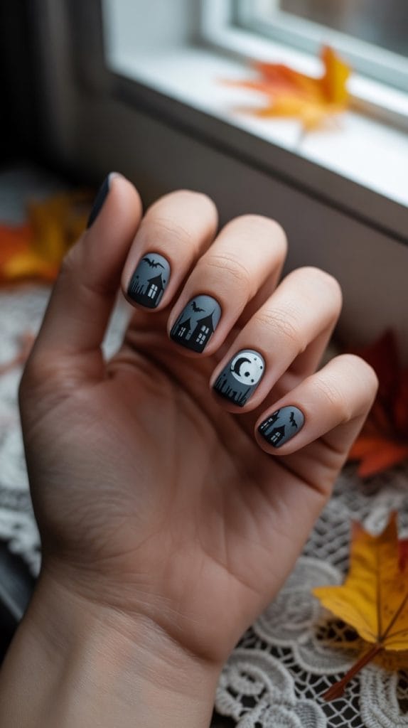 Get spooky with a haunted house nail design. Use a dark base and add details like haunted house silhouettes, bats, and full moons. You can also incorporate some glow-in-the-dark polish for an extra eerie effect. This design is perfect for those who love a good scare and want their nails to reflect their love for Halloween.