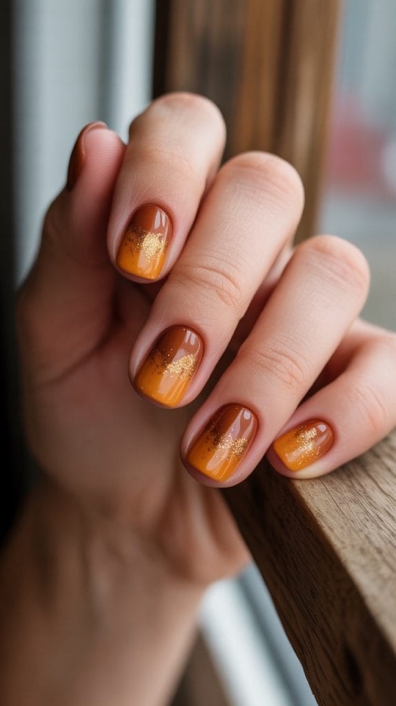 Channel the golden hues of a bountiful harvest with nails that shimmer in gold. Use gold polish as a base and add details like wheat stalks or corn to capture the essence of autumn’s bounty. You can also incorporate some green or brown accents for a more earthy feel. This design is perfect for those who appreciate the abundance and warmth of the harvest season.