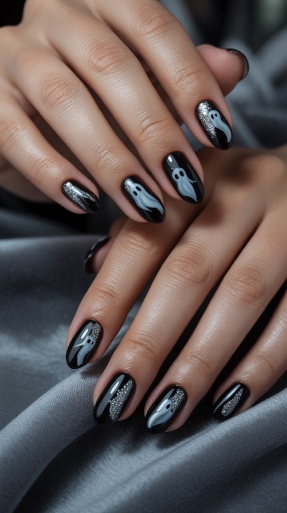 Get into the Halloween spirit with a ghostly glam nail design. Use a black or dark purple base and add ghost decals or hand-paint ghostly figures. You can also incorporate some glitter or rhinestones for a touch of glam. This design is perfect for those who love a spooky yet stylish look for October.