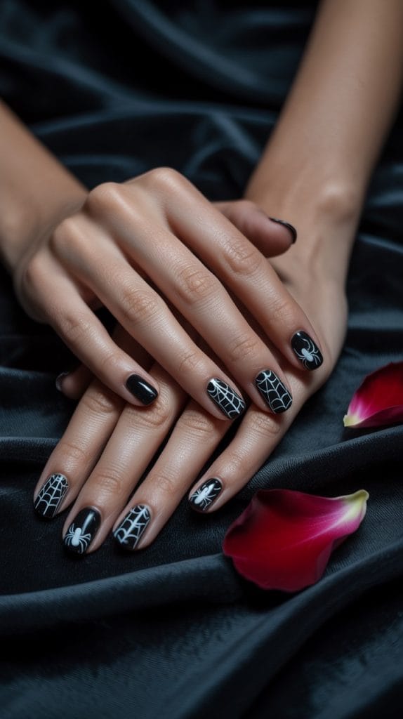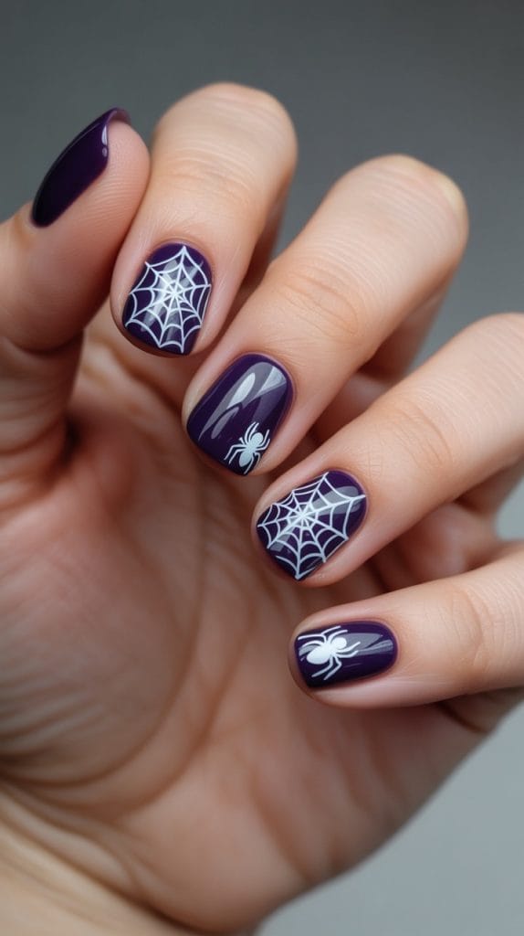 Get ready for Halloween with a spooky spider web design. Start with a black or dark purple base and use white or silver polish to create intricate web patterns on each nail. Add a tiny spider decal or hand-paint a spider for an extra creepy effect. These nails are perfect for Halloween parties or just getting into the spooky spirit of October.