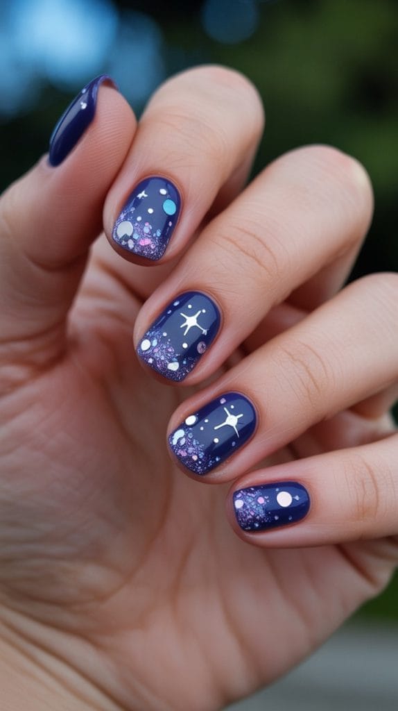 Capture the magic of twilight with a sparkling nail design. Use dark blue or purple as your base and add glitter or rhinestones to mimic the twinkling stars. You can also incorporate some moon or star decals for a celestial touch. This design is perfect for those who love the enchanting beauty of the night sky.
