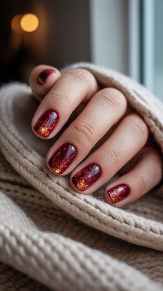 Capture the warmth of a crackling fire with an enchanting embers nail design. Use dark red or black as your base and add glitter or foil accents in red, orange, and gold to mimic the look of glowing embers. This design is perfect for those who love the cozy, comforting feel of a warm fire.