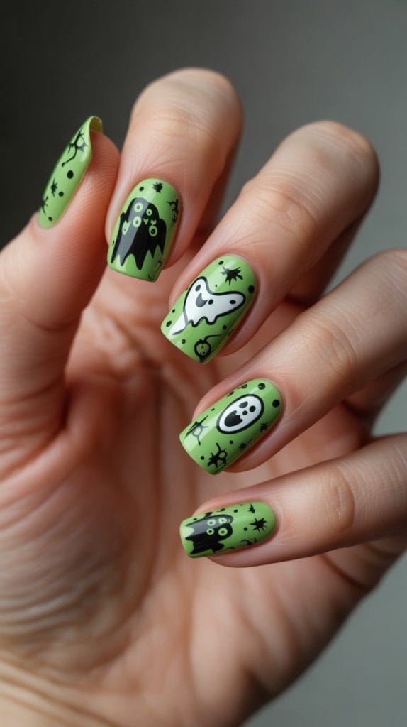 Embrace the spooky vibes of Halloween with a ghoulish green nail design. Use various shades of green as your base and add ghost or ghoul decals for a creepy touch. You can also incorporate some glow-in-the-dark polish for an extra eerie effect. This design is perfect for those who love a spooky and fun Halloween look.