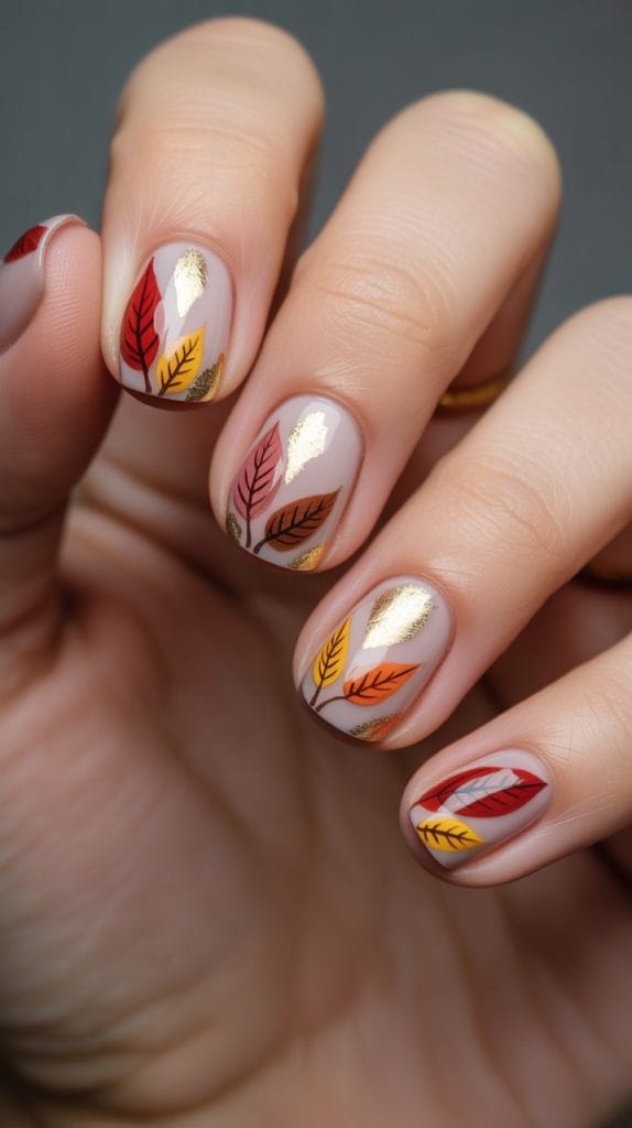 Capture the beauty of fall foliage with nails that feature autumn leaf designs. Use a variety of autumnal colors like red, orange, yellow, and brown to paint leaves on a neutral or clear background. You can also incorporate some gold foil to add a touch of elegance and mimic the golden hues of fall leaves. This design is perfect for nature lovers and those who cherish the fall season.