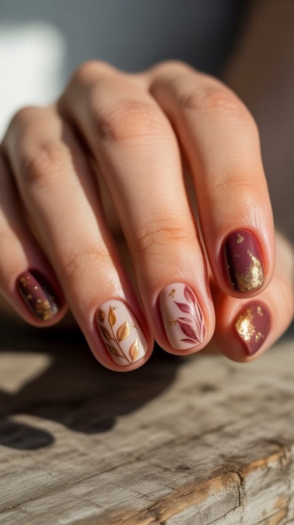 Embrace the warm, rustic vibes of autumn with a romantic nail design. Use warm shades like burgundy, brown, and gold as your base and add floral or leaf designs for a touch of romance. You can also incorporate some matte polish for a soft, velvety finish. This design is perfect for those who love the cozy, romantic feel of autumn.