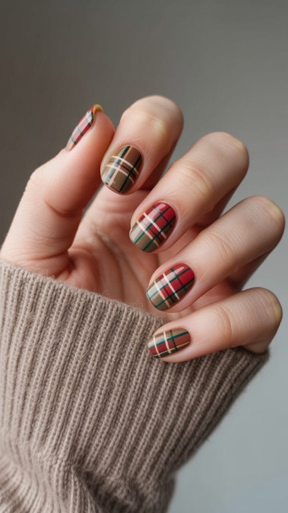 Embrace the cozy vibes of autumn with a plaid nail design. Use classic fall colors like red, green, and brown to create a plaid pattern on your nails. You can use nail tape for precise lines or freehand the design for a more rustic look. This design is perfect for those who love the cozy, comforting aesthetic of autumn fashion.