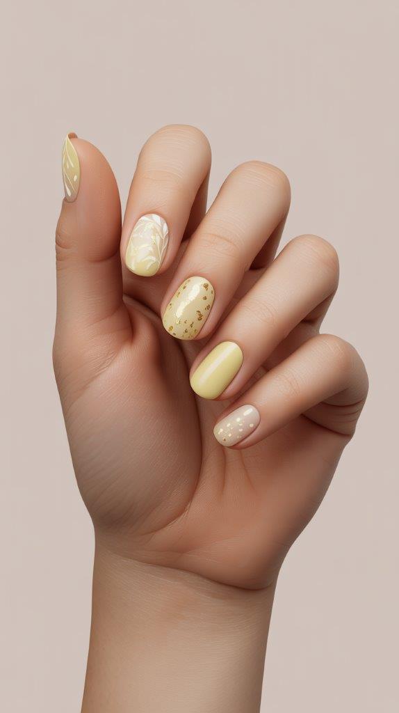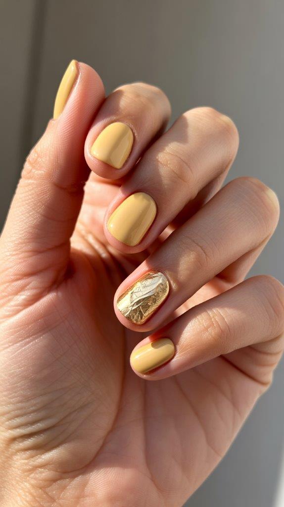 Elevate your pale yellow base with a touch of luxury. Imagine a nude-pale yellow blend on most nails, with one ring finger adorned in delicate, crinkled gold foil. The warm gold against the cool yellow creates a stunning, sun-kissed effect that’s perfect for a special event.