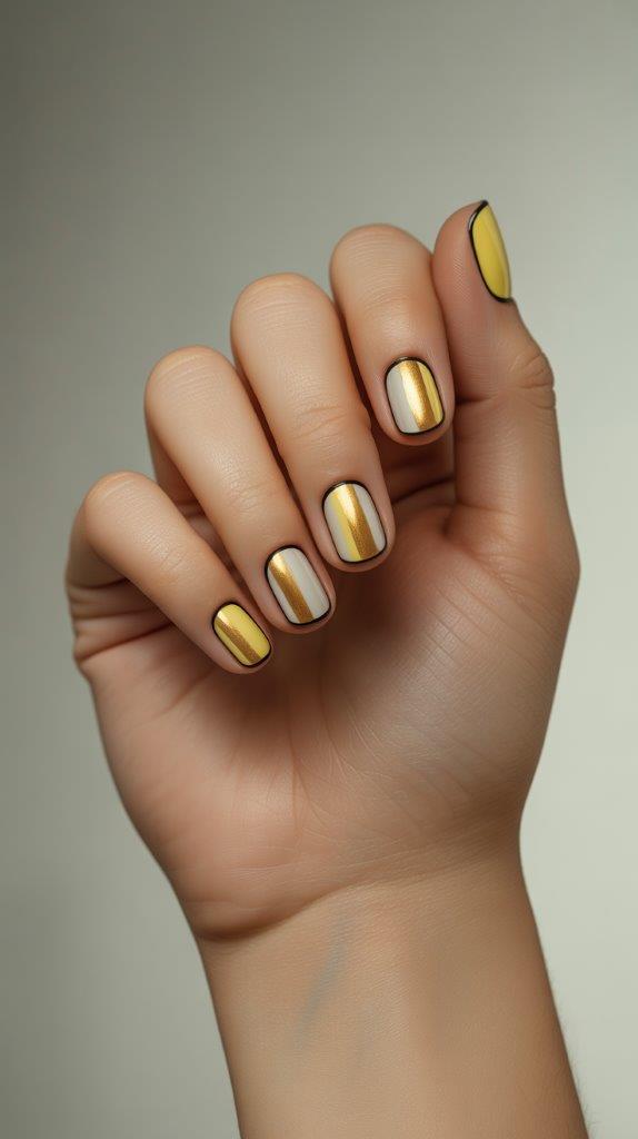 Sometimes less is more. A single, thin vertical stripe of pale yellow painted along the side of a nude or white nail. It’s a slimming, elongating detail that’s so cool and understated. The epitome of quiet luxury in nail art.