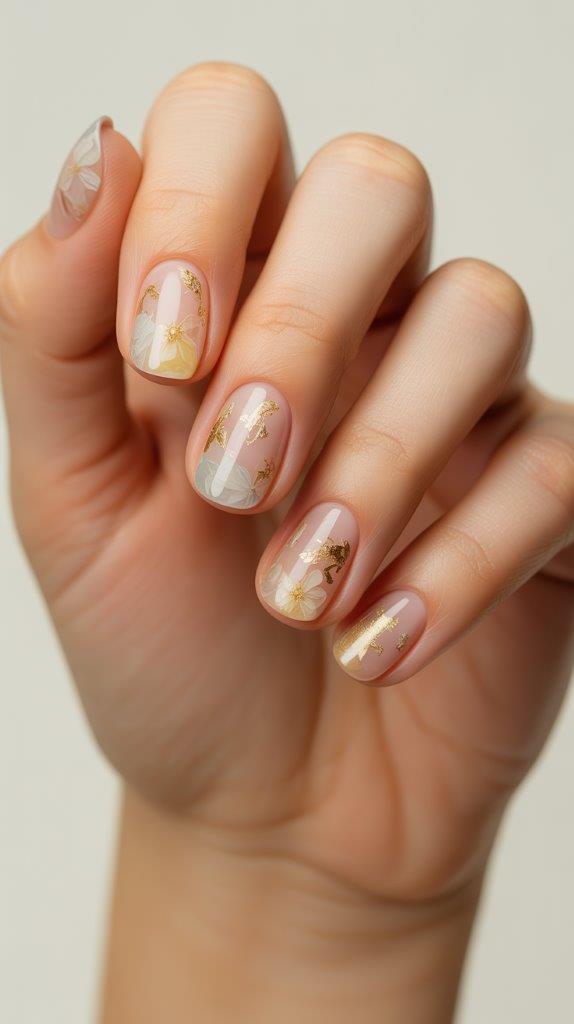 Go 3D with this beauty. Your nail artist places tiny dried flowers or gold flakes on the nail, then seals them under a thick layer of clear gel or acrylic, creating a “frozen in ice” look. On a pale yellow base, it’s like a spring garden preserved on your hands.