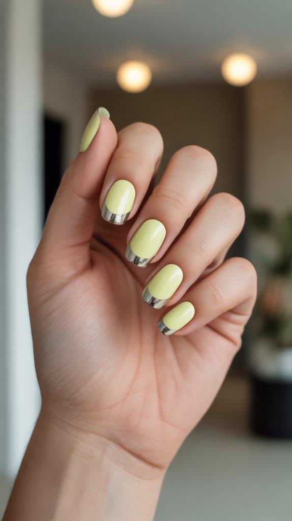 A modern twist on the French manicure. Instead of a colored tip, the very edge of your nail gets a mirror-like chrome finish over the pale yellow. It’s sharp, it’s reflective, and it catches the light in the most incredible way. Talk about a statement.